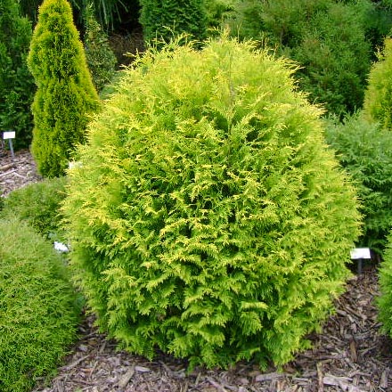 Декоративные качества: Декоративна благодаря шаровидной естественной форме кроны и золотисто-зеленой хвои.